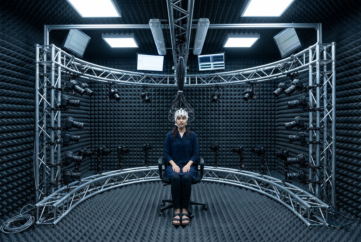 A human subject takes the center stage within a specialized environment, where advanced sensors record subtle human expressions, gestures, poses, movements, and responses from various perspectives.